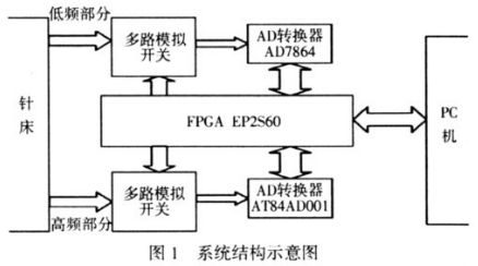 本自動測試系統(tǒng)的結(jié)構(gòu)框圖見圖1。系統(tǒng)的工作原理是:通過針床將待測信號導(dǎo)出,F(xiàn)PGA 通過控制多路模擬開關(guān)將待測信號采集進(jìn)來,將數(shù)據(jù)通過相應(yīng)協(xié)議傳送到PC 機(jī),用自動測試軟件測試各個信號是否正常。