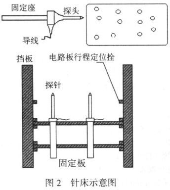 針床是電路板測試系統(tǒng)的重要部件,是電路板信號導(dǎo)出的平臺。針床的通用性較差,一般是每種電路板對應(yīng)一個特定的針床,這使系統(tǒng)的通用性受到很大的限制。為使針床具有一定的通用性,本系統(tǒng)中對針床的相關(guān)部件進(jìn)行了一些改進(jìn):
