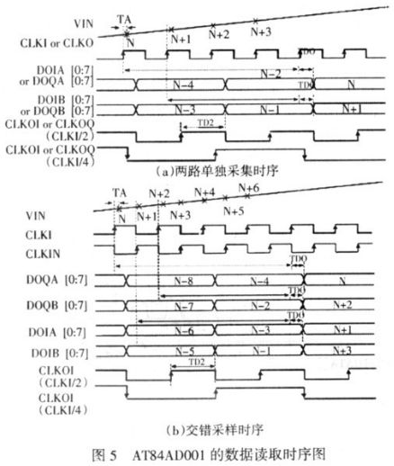 AT84AD331 可以配置成I 路和Q 路單獨(dú)使用,此時可以同時采集兩路信號,最高采樣率為1 Gs/s;也可以配置成I 和Q 路的交錯采樣,此時只能采集1 路信號,等效采樣率為2 Gs/s,使用時可以根據(jù)需要對該芯片進(jìn)行在線配置。FPGA 對AT84AD331數(shù)據(jù)讀取時序見圖5。