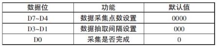 其中D7~D4 為數(shù)據(jù)采集的點數(shù)設(shè)置,3333B 表示64 個,1111 表示1 324 個,步進(jìn)為64。D3~D1 為數(shù)據(jù)抽取的間隔設(shè)置,333 表示抽取間隔為3,全部數(shù)據(jù)有效;111 表示抽取間隔為28,即每隔28 個點抽取一個點,步進(jìn)為4。設(shè)置這幾位的目的是為了適應(yīng)信號頻率的要求,防止采集數(shù)據(jù)不足一周期的狀況發(fā)生。D3位為標(biāo)志位,功能和操作與5 bit 的寄存器的對應(yīng)位完全相同。本寄存器分高4 位和低4 位兩次設(shè)置。