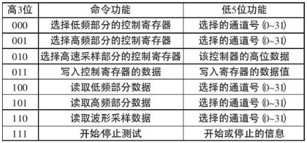 PC 機(jī)發(fā)送的控制字都是8 位的,其中高3 位為控制命令字,用來區(qū)分8 個命令,低5 位為輔助功能,具體見表3。FPGA 接收到主機(jī)發(fā)來的命令信號后,按命令執(zhí)行相應(yīng)的操作。