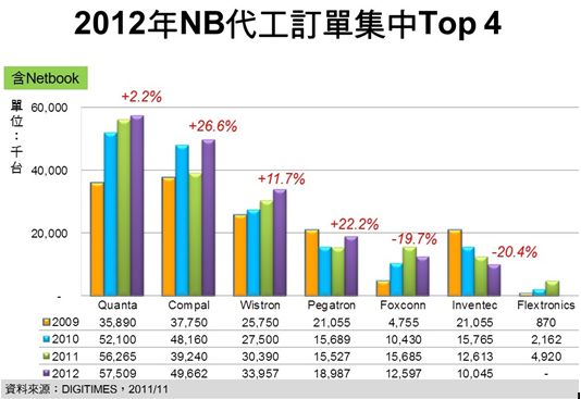 - 2012年NB代工廠將僅前4大業(yè)者出貨可成長