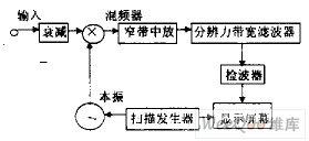 現(xiàn)在所用的頻譜分析儀多為超外差式,并采用多次變頻(3~4次),以降低中頻頻率,實現(xiàn)窄通帶和高分辨力。超外差式頻譜分析儀的基本工作原理如圖 1所示。輸入信號與本振(LO)混頻,產(chǎn)生中頻(IF)信號經(jīng)窄帶中放被送到包絡(luò)檢波器,檢波器輸出信號被放大并使屏幕顯示產(chǎn)生垂直偏轉(zhuǎn),掃描發(fā)生器保證屏幕顯示的水平頻率軸和本地振蕩器調(diào)諧同步,它同時驅(qū)動水平偏轉(zhuǎn)調(diào)諧LO。