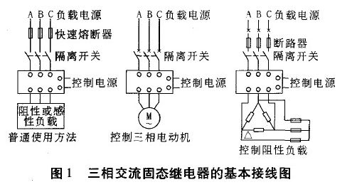 單相SSR為四端有源器件,其中兩個(gè)輸入控制端,兩個(gè)輸出端,輸入輸出間為光隔離,輸入端加上直流或脈沖信號(hào)到一定電流值后,輸出端就能從斷態(tài)轉(zhuǎn)變成通態(tài)。而三相交流固態(tài)繼電器則是集三只單相交流固態(tài)繼電器為一體,并以單一輸入端對(duì)三相負(fù)載進(jìn)行直接開關(guān)切換,可方便地控制l一相交流電機(jī)、加熱器等三相負(fù)載,圖1為三相交流固態(tài)繼電器的基本接線圖。三相交流固態(tài)繼電器的相與相問(wèn),輸入輸出間,以及與基板之間絕緣電壓大于2 000 VAC,其他基本指標(biāo)與相應(yīng)的單相固態(tài)繼電器相同。需要指出的是對(duì)實(shí)際負(fù)載電流不大的場(chǎng)合,比如實(shí)驗(yàn)室教學(xué),三相SSR使用起來(lái)比較方便,但電流大時(shí)發(fā)熱亦大,這時(shí)使用三只單相SSR更為可靠。