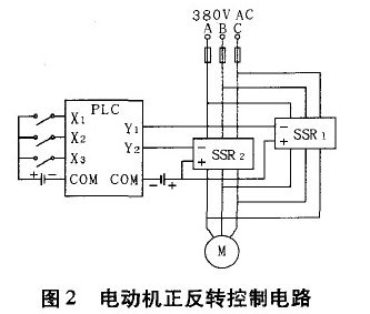 圖2為PLC控制的三相交流電動(dòng)機(jī)正反轉(zhuǎn)控制電路,其中X1、X2、X3,分別表示PLC的輸入,控制電動(dòng)機(jī)的轉(zhuǎn)動(dòng)方向與起停;Y1、Y1表示PLC的輸出。當(dāng)Y1有效時(shí),SSR1輸入端得到DC24V的直流信號(hào),則三相輸出端從斷態(tài)轉(zhuǎn)變成通態(tài),三相交流電動(dòng)機(jī)得電,反轉(zhuǎn);同理當(dāng)Y 有效時(shí),SSR2的三相輸出端接通,因A、c換向則電動(dòng)機(jī)正轉(zhuǎn)。