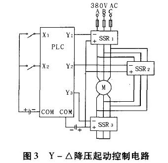 圖3為PLC控制的Y-△降壓起動(dòng)控制電路,其中X1、X2分別表示PLC的輸入,控制電動(dòng)機(jī)的起停;Y1、Y2、Y3表示PLC的輸出。當(dāng)Y1和Y3有效時(shí),對(duì)應(yīng)的SSR1和SSR3也同時(shí)有效,此時(shí)電動(dòng)機(jī)為Y型接法,延時(shí)幾秒后,Y3失效,Y2有效,則對(duì)應(yīng)的SSR3三相輸出端斷開,SSR2三相輸出端合上,則電動(dòng)機(jī)變?yōu)椤鹘臃?,完成了Y一△降壓起動(dòng)。