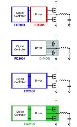 FD2004可以與外部柵極驅動器 (如FD1505) 和分立式MOSFET ,或是集成了驅動器與MOSFET的單封裝DrMOS產(chǎn)品協(xié)同工作。它還可以在獨立式應用中通過電阻 來編程—特別地,輸出電壓的最大值由電阻設定,且利用軟件命令設定的電壓最大值不得超過10%以上,以保護負載。在需要較大電流的應用中,如多相轉換器,所選的架構可實現(xiàn)多達8個相位的電流共享,而且可在輸出功率較低時實現(xiàn)切相 (phase shedding) 來保持高效率。該款控制器基于帶自適應性能算法和環(huán)路補償?shù)臄?shù)字控制環(huán)路,支持高達1.4MHz的開關頻率。時鐘同步可協(xié)助提升EMI性能。對于同時需要集成式驅動器和分立式外部MOSFET的應用,FD2006也是個不錯的選擇。