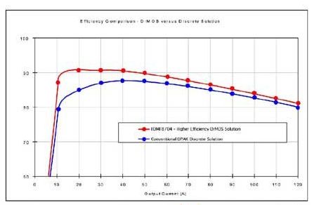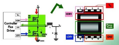 1.帶驅動器和MOSFET的分立式解決方案現(xiàn)在仍在普遍使用。為滿足所有設計要求,現(xiàn)在飛兆半導體提供的采用小尺寸熱性能增強型MLP(QFN) 封裝的產(chǎn)品,可獲得高系統(tǒng)性能。MOSFET實現(xiàn)了首先采用MLP封裝(見圖3所示)。其Power56和Power33產(chǎn)品系列采用最新的PowerTrench技術,能夠同時提供超低RDSon 和低Qg,從而適用于高開關頻率應用。鍵合技術可減小封裝的電感 ,提高封裝有限的ID ,適用于大電流應用。其低端FET產(chǎn)品組合采用SyncFET集成了肖特基二極管 ,在實現(xiàn)高開關性能的同時降低了熱耗。