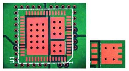 至于版圖布局,金屬較多顯然很有助益。更厚的頂層有助于降低溫度,不過也許對PCB的其余部分并不適合,因為成本增加了,其它元件需要的更精細的間距也不可能實現(xiàn)。更大的銅面積很有用,但又會消耗PCB空間。這些應該盡可能由焊料覆蓋,因為金屬表面比涂漆表面的散熱性更好。在多層PCB中,有時利用內(nèi)層來協(xié)助散熱。熱通孔 (填充焊料) 有時可用來把熱量擴散到PCB的另一面去 (圖9)。