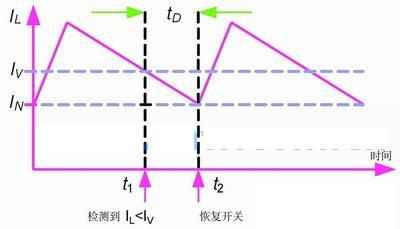 一般而言,通常采用比較器來(lái)檢測(cè)IL是否超出IV,以決定關(guān)斷或重新開通??墒?比較器會(huì)帶來(lái)延時(shí)tD,影響閾值的有效值。如圖2所示,比較器在t1時(shí)刻檢測(cè)到IL< p> V,可是偶遇延時(shí)tD,開關(guān)會(huì)在t2時(shí)刻被恢復(fù)?;谶@個(gè)原因,有效閥值IN便會(huì)低于IV,這樣,實(shí)際的輸出IOUT(CL)為: