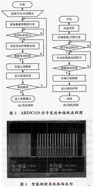對此便攜式低功耗雷達導航儀智能測控系統(tǒng)的測試內(nèi)容包括:發(fā)送數(shù)據(jù)、接收數(shù)據(jù)和發(fā)送數(shù)據(jù)間隔等測試。由于HS3282的兩路輸出是差分輸出的,所以只需要測試其中的一路就可以了。智能測控系統(tǒng)現(xiàn)場波形如圖4所示,發(fā)送的數(shù)據(jù)采用自動模式,控制字為奇校驗。通過示波器直接觀察HS3282芯片的輸出信號,輸出電平是3.92 V,滿足TTL的電平要求。而數(shù)據(jù)之間的時間間隔,即組間數(shù)據(jù)4位間隔。由單片機的延時程序即可完成。