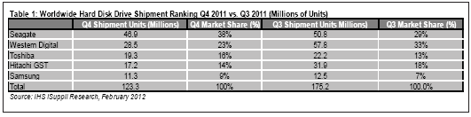 據(jù)IHS iSuppli公司的存儲市場簡報,2011年第四季度希捷重新奪回硬盤(HDD)出貨量的第一排名。此前七個季度西部數(shù)據(jù)一直保持第一,但去年的泰國洪災令其損失慘重。