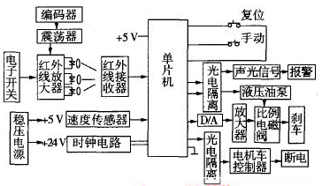 紅外線發(fā)射單元包括編碼調(diào)制器、載波振蕩器、電子開(kāi)關(guān)、發(fā)射管、聚光透鏡等組成;紅外接收單元為紅外集成一體化接收頭;主控制單元由單片機(jī)、時(shí)鐘電路、復(fù)位電路、手動(dòng)操作鍵盤(pán)、D/A轉(zhuǎn)換器組成;執(zhí)行單元由光電隔離器、模擬放大器組成;聲光報(bào)警單元由電機(jī)車(chē)電笛和閃光報(bào)警電路構(gòu)成;液壓制動(dòng)單元由速度傳感器、液壓油泵、比例電磁閥、溢流閥、液壓油缸、剎車(chē)推桿等組成。