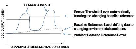 保持可靠性能。容性傳感器電極是采用PCB上的標準銅材料或柔性材料制成的。這種材料的特性會隨溫度和濕度的變化而發(fā)生改變。這種變化會使基線電平發(fā)生偏移(所有傳感器閾值電平均是以基線電平為參考的)。較大的基線偏移增加了接觸閾值電平過低或過高的風險(過低還是過高取決于基線偏移的方向)這會引起虛假的接觸誤差,或使閾值電平不是太靈敏就是不夠靈敏,導(dǎo)致接觸狀態(tài)的不穩(wěn)定。為保持傳感器原始的信號接觸閾值檢測電平余量(靈敏度),CDC需要自動跟蹤基線偏移誤差的幅度,并對閾值設(shè)置進行相應(yīng)的重新調(diào)整。圖2中的示例介紹了AD7147和AD7148的閾值電平如何針對因環(huán)境條件變化引起的基線失調(diào)變化進行自動跟蹤和調(diào)整。