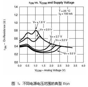 低導(dǎo)通電阻往往是模擬開關(guān)在音頻切換時(shí)的主要選擇因素。值得注意的是,導(dǎo)通電阻是針對(duì)具體的VCC、VIN(電壓輸入)及給定負(fù)載電流而指定的。在晶體管級(jí),RON為器件長(zhǎng)度(L)、器件寬度(W)、電子與空穴遷移率、氧化層電容、門限電壓及信號(hào)電壓的函數(shù)?! ?br />