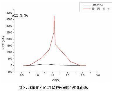 圖2中可以看出采用該改善技術(shù)的英聯(lián)UM3157模擬開關(guān)產(chǎn)品與普通同系列模擬開關(guān)產(chǎn)品在ICCT上的顯著區(qū)別?! ?br />