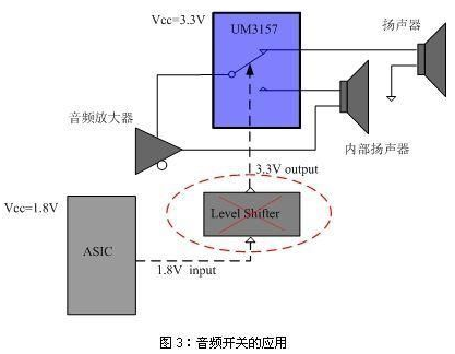 此外,英聯(lián)的低ICCT系列模擬開關(guān)具有更低的VIH電平值,可以使用較低的控制電平實(shí)現(xiàn)開關(guān)的高電平切換控制。產(chǎn)品的這種特性大大減少了系統(tǒng)工程師設(shè)計(jì)電路的復(fù)雜性,特別是在供電電源和控制信號(hào)電平不匹配的便攜產(chǎn)品應(yīng)用中可以免除使用電平轉(zhuǎn)換模塊,從而有效降低了成本。以模擬開關(guān)用來(lái)切換音頻信號(hào)為例,如圖3所示,可以使用ASIC傳輸過(guò)來(lái)的1.8V電壓直接來(lái)控制UM3157的控制管腳,而不必采用電平轉(zhuǎn)移器也能在實(shí)現(xiàn)開關(guān)切換的同時(shí)達(dá)到很小的漏電流。此外,由于低ICCT模擬開關(guān)不消耗很多功耗(大約1uA),且開關(guān)的導(dǎo)通電阻隨工作電壓的增加而降低,設(shè)計(jì)人員可以使用較高的供電電壓來(lái)達(dá)到更低的導(dǎo)通電阻。對(duì)于典型的音頻開關(guān)或USB應(yīng)用,低的導(dǎo)通電阻是非常重要的。