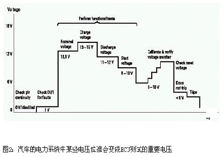 依汽車的操作狀態(tài)而定,在汽車的電力系統(tǒng)中常會碰到某些電壓位準。這些位準會變成ECU測試的重要電壓,如圖2所示。在這些重要電壓下執(zhí)行的一些相關測試包括: