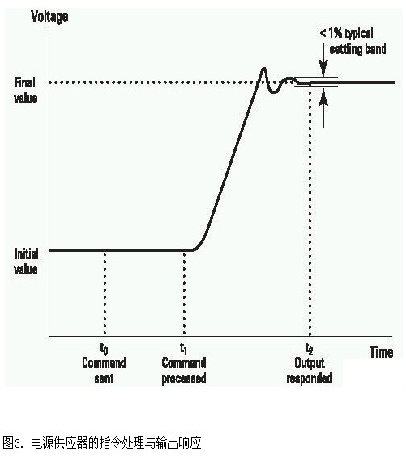 將電源供應器的輸出電壓設定變更為新值時,必須經(jīng)歷幾個步驟,如圖3 所示。這些步驟所花的時間很有限。當電源供應器接收到指令時,必須加以處理,因此會有一段指令處理時間。接著,電源供應器的輸出會予以回應并變更成新的設定。它在某個穩(wěn)定區(qū)段內(nèi)達到終值所花的時間,即為輸出響應時間。1%的穩(wěn)定區(qū)段對ECU 測試來說是合適的。特別需要注意的是下調(diào)設定時的輸出響應時間。許多電源供應器都必須依賴真實的DUT 負載來降低電壓,在負載較小的情況下,一些不具下調(diào)設定器的電源供應器可能需要花一秒左右的時間來達到終值。N6752A 電源供應器模組內(nèi)建了一個下調(diào)設定器,能夠加快下調(diào)設定的速度,而不受負載的影響。在ECU 測試中,上調(diào)與下調(diào)設定都必須夠快才行?! ?br />