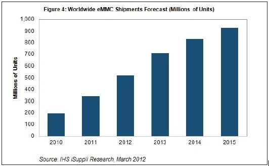 據(jù)IHS iSuppli公司的移動與嵌入存儲市場簡報,2013年eMMC解決方案的出貨量預(yù)計達到7.111億個,高于2012年的5.203億個。