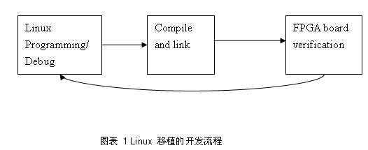 使用者開始進行Linux移植到晶心平臺,首先須先選定一版晶心的Linux原始碼作為基準再進行軟件移植,修改原始碼以符合使用者的開發(fā)平臺,經(jīng)由工具鏈的compile與link所產(chǎn)生的Linux的映像文件,再放到FPGA板上以驗證程序編寫的正確與否,依此開發(fā)程序:軟件編寫->FPGA板驗證,再回到軟件編寫程序直到所有周邊IP在FPGA板上驗證完全,Linux 移植才完成,如圖表 1所示,Linux移植過程中,AICE調試可以有效加快Linux移植的速度。