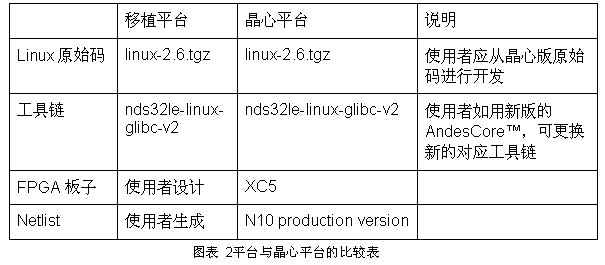 移植平臺是指使用者要移植Linux的平臺,也就是移植Linux的目標平臺。將移植平臺與晶心平臺的比較列表如下: (其中所列之軟件皆屬于BSP310中之套件)。