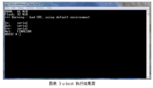 patch 完成的u-boot source code 可以產(chǎn)生ROM版的u-boot image,直接開機后的執(zhí)行結果如圖表3所示。