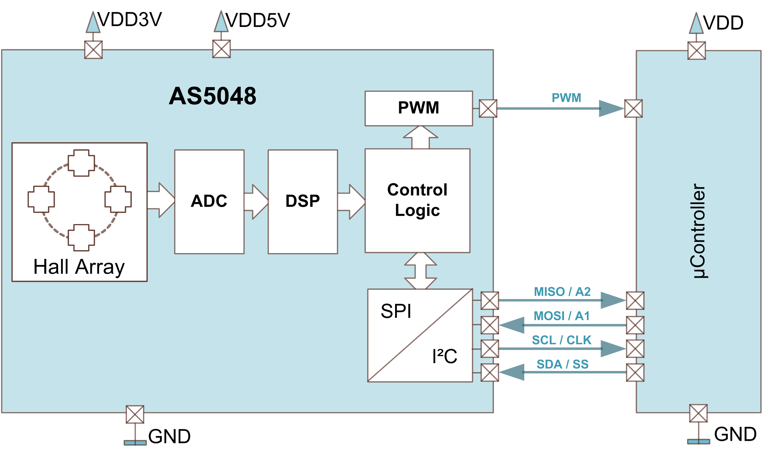 AS5048提供PWM輸出以及SPI或I2C接口,為微控制器提供絕對角度測量。在進行機械設(shè)計時無須考慮芯片初始零位和它 所使用磁鐵磁極的精確配對,取而代之的方案是:零位早在組裝時通過簡單的SPI或I2C命令(無需特殊的編程設(shè)備)即可編程進AS5048內(nèi)部的存儲器。
