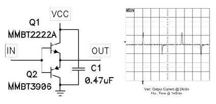 如圖2 hfe曲線所示,通常廠商都不會(huì)為這些低電流器件提供高于0.5A的電流。但是,該電路可提供大大高于0.5A的電流驅(qū)動(dòng),如圖1中的波形所示。就該波形而言,緩沖器由一個(gè)50Ω源驅(qū)動(dòng),負(fù)載為一個(gè)與1Ω電阻串聯(lián)的0.01 uF電容。該線跡顯示了1Ω電阻兩端的電壓,因此每段接線柱上的電流為2A.該數(shù)字還顯示MMBT2222A可以提供大約3A的電流,MMBT3906吸收2A的電流?! ?br />