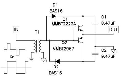 圖1中的示意圖顯示了一個(gè)NPN/PNP發(fā)射跟隨器對(duì),其可用于緩沖控制IC的輸出。這可能會(huì)增加控制器的驅(qū)動(dòng)能力并將驅(qū)動(dòng)損耗轉(zhuǎn)移至外部組件。許多人都認(rèn)為該特殊電路無(wú)法提供足夠的驅(qū)動(dòng)電流?! ?br />