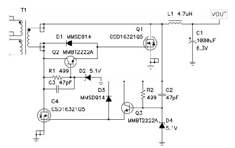 圖 4 顯示的是用于控制同步反向拓?fù)渲?Q2 傳導(dǎo)的分立器件。該電路可以讓您控制開(kāi)啟柵極電流并保護(hù)整流器柵極免受高反向電壓的損壞。該電路可以用變壓器輸出端的負(fù)電壓進(jìn)行驅(qū)動(dòng)。12V 輸入與 5V 輸出相比負(fù)電壓值很大,從而引起 Q1 傳導(dǎo)并短路電源 FET Q2 上的柵-源電壓,迅速將其關(guān)閉。由于基極電流流經(jīng) R2,因此在加速電容 C1 上就有了一個(gè)負(fù)電壓。在此期間,一次側(cè) FET 將會(huì)發(fā)生傳導(dǎo)并在變壓器磁化電感中存儲(chǔ)能量。一次側(cè) FET 關(guān)閉時(shí),變壓器輸出電壓在正電壓范圍擺動(dòng)。Q2 柵-源通過(guò) D1 和 R1 被迅速前向偏置。C1 放電時(shí),D2 對(duì) Q1 基極-發(fā)射極連接進(jìn)行保護(hù)。在一次側(cè) FET 再次開(kāi)啟之前,該電路會(huì)一直保持這種狀態(tài)。正如同步降壓轉(zhuǎn)換器那樣,輸出電流會(huì)真正地對(duì)輸出電容進(jìn)行放電。開(kāi)啟一次側(cè) FET 會(huì)衰減變壓器二次側(cè)上的電壓并去除 Q2 的正驅(qū)動(dòng)。這種轉(zhuǎn)換會(huì)導(dǎo)致明顯的貫通疊加一次側(cè) FET 和 Q2 傳導(dǎo)次數(shù)。為了最小化該次數(shù),當(dāng)一次側(cè)和二次側(cè) FET 均開(kāi)啟時(shí),Q1 將會(huì)盡快地短路同步整流器上的柵-源。