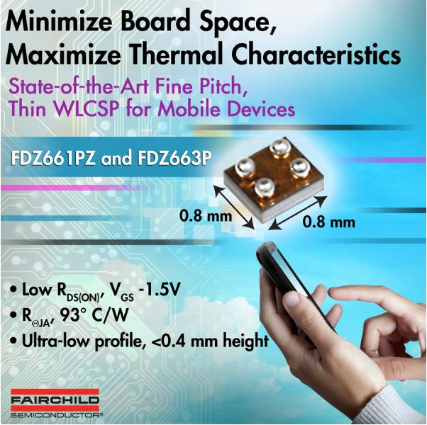 便攜設(shè)備的設(shè)計(jì)人員面臨著在終端應(yīng)用中節(jié)省空間、提高效率和應(yīng)對(duì)散熱問題的挑戰(zhàn)。為了順應(yīng)這一趨勢(shì),飛兆半導(dǎo)體公司(Fairchild Semiconductor)開發(fā)了FDZ661PZ和FDZ663P P溝道、1.5V規(guī)格的PowerTrench®薄型0.8mm x 0.8mm WL-CSP MOSFET器件。