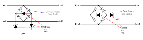• 在較高數(shù)據(jù)傳輸頻率上,盡量采用低電容系列的產(chǎn)品B6A、B8C、SAC、LCE或通過(guò)二極管作降容處理,參考如示意圖2001 ABD、ISO7637 汽車電子等標(biāo)準(zhǔn)