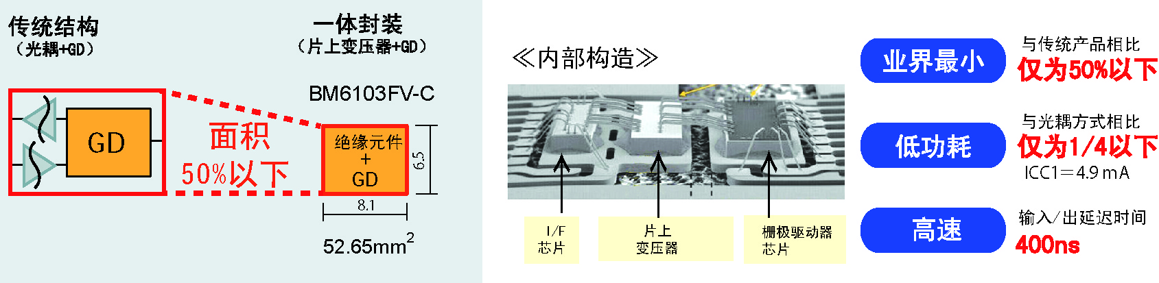 此次羅姆采用獨創(chuàng)的微細加工技術(shù),開發(fā)出片上變壓器工藝,進而成功開發(fā)出小型并且內(nèi)置了絕緣元件的柵極驅(qū)動器。無需外置零件,同時通過采用小型封裝,與傳統(tǒng)產(chǎn)品相比,安裝面積減少了約50%。不僅如此,由于內(nèi)置車載逆變器電路所需的全部保護功能,不僅有助于實現(xiàn)逆變器的小型化,還非常有助于減輕設(shè)計負擔。