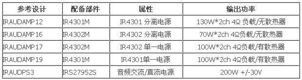 這些器件的其他主要功能包括過流保護(hù)、熱關(guān)斷、內(nèi)/外部關(guān)閉和浮動(dòng)差分輸入。IR4302M還具有削波檢測功能。此外,IR還提供一系列參考設(shè)計(jì),進(jìn)一步簡化采用這些器件的系統(tǒng)設(shè)計(jì)。