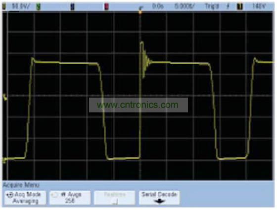 這種算法在垂直分辨率為12位時(shí)效果最好,因?yàn)樵倮^續(xù)增加下去,其他因數(shù)(例如示波器的垂直增益或偏置精度)將起到?jīng)Q定性作用。平均模式的優(yōu)點(diǎn)是,它對(duì)示波器的實(shí)時(shí)帶寬沒(méi)有任何限制。缺點(diǎn)是它要求使用重復(fù)性信號(hào),并會(huì)降低波形更新速率。在正常采集模式下與平均模式下捕獲的開(kāi)關(guān)電源的Vds分別如圖1和圖2所示。