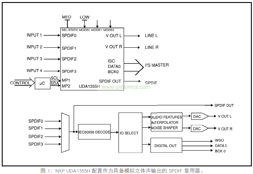圖 1 顯示了配置為 1/4 SPDIF 的多路復(fù)用器,有模擬立體聲輸出的 NXP UDA1355H。請注意,復(fù)用器中選擇的SPDIF 信號也可以傳輸?shù)?SPDIF 輸出,使組件可以使用菊花鏈,保持?jǐn)?shù)字域音頻,維持音頻質(zhì)量。因此,可以很容易地實(shí)現(xiàn) 1/(3n+1)多路復(fù)用器,其中第 n 個DAC,I2S 或 SPDIF 作為主復(fù)用輸出。如果這是所需要的全部,通過簡單將 SEL_STATIC引腳設(shè)置為高( 靜態(tài)模式),而不是中(I2C 模式),僅使用 UDA1355H無須微控制器就可以實(shí)現(xiàn)。