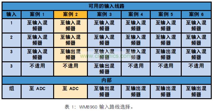 WM8960 提供了全面的內(nèi)部路由選項(xiàng),表 1 顯示了路由輸入有多么靈活。案例 2 描述了圖 4 所示的信號路徑路由。