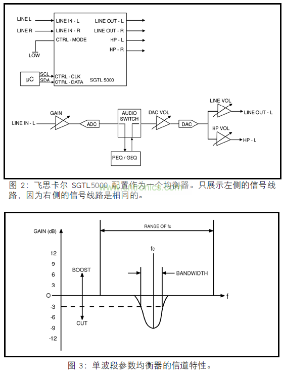 來自飛思卡爾半導(dǎo)體的 SGTL5000 編解碼器,提供了增強(qiáng)音頻功能的不同選擇。圖 2 顯示了使用設(shè)備均衡塊的應(yīng)用,可以作為音調(diào)控制器,七波段參數(shù)均衡器或五波段圖形均衡器。