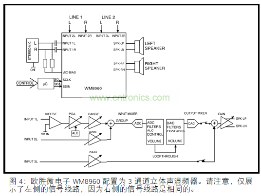 其它功能包括主音量,自動音量控制,環(huán)繞立體聲和低音增強(qiáng)。SGTL5000 還提供了一個集成的耳機(jī)放大器。第三個設(shè)備,來自歐勝微電子的 WM8960,是目前編解碼器中高水平集成技術(shù)的代表。此部分顯示在圖 4 中,已配置為立體聲麥克風(fēng)和兩個立體聲線路級源的立體聲混頻器,帶有直接(D 類)揚(yáng)聲器驅(qū)動器。它還包括一個片載耳機(jī)驅(qū)動器,連接 16Ω 負(fù)載,功率可達(dá) 40mW。