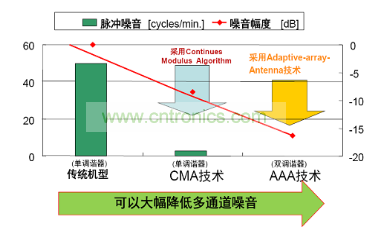 圖2將CMA及AAA技術的多通道噪聲消除性能與傳統(tǒng)技術單調(diào)諧器進行了比較。左邊縱軸是每分鐘脈沖噪聲的發(fā)生次數(shù),右邊縱軸是噪聲強度,很明顯,安森美半導體的單調(diào)諧器技術可以大幅降低多通道噪聲,且雙調(diào)諧器AAA技術幾乎可以完全消除多通道噪聲。