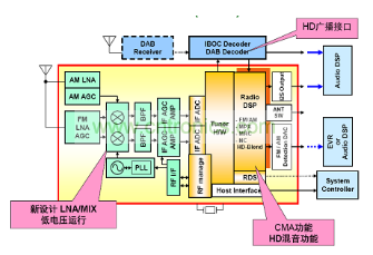 圖4是安森美半導體DSP調(diào)諧器的框圖。從圖中可以看出,模擬前端是新設計的新設計LNA和MIX,可低電壓運行,只需5 V供電;數(shù)字后端可以支持廣播接口。DSP采用CMA算法,具有HD混音功能。