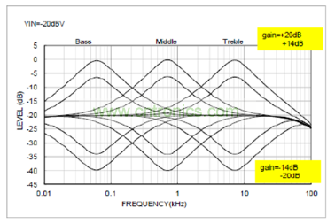 為了實現(xiàn)音效處理,有必要了解一下音頻DSP均衡器(EQ) 的作用。均衡器具有增益及濾波的電路,增益電路對聲音進行提升(Boost) 與削弱(Cut) ;濾波電路可以調(diào)節(jié)到需要的頻率響應。普通模擬音效處理IC一般可以提供2頻帶(Bass/Treble) 或者3頻帶(Bass/Middle/Treble),而數(shù)字音效處理IC可以提供多個頻帶,比如7頻帶,甚至更多。圖5是3頻帶EQ的曲線。