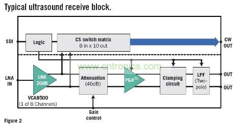 首先以超聲波設(shè)備為例來探討模擬性能需求。通過該范例,本文將介紹如何在性能、功耗、尺寸以及集成度之間進(jìn)行權(quán)衡,并檢測雙極性與CMOS工藝技術(shù)的適用性。圖1是典型超聲波機(jī)器的系統(tǒng)方框圖,展示了傳輸與接收兩個(gè)部分。這兩個(gè)部分負(fù)責(zé)驅(qū)動(dòng)傳感器與數(shù)字處理部分(未顯示),從而構(gòu)成完整的超聲波設(shè)備。