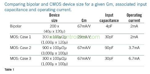 表1是用于放大器的雙極性器件和CMOS器件的尺寸比較。CMOS器件較大的尺寸及伴隨的輸入電容嚴(yán)重限制了放大器的輸入帶寬。在本例中,采用雙極性放大器可實(shí)現(xiàn)低偏置電流下的低噪聲。但使用雙極性器件可能會(huì)有基電流噪聲,而這在CMOS器件中則可以忽略不計(jì)。該基電流噪聲的幅度取決于傳感器的阻抗和系統(tǒng)具體的實(shí)施情況。
