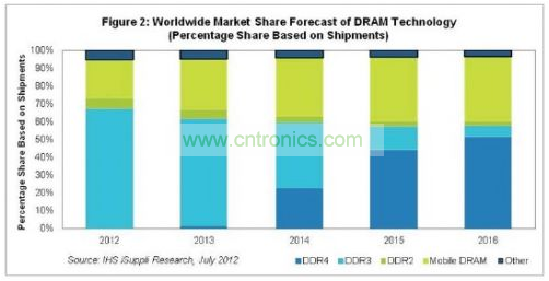 考慮到2011年出貨量為零,今年出貨量預(yù)計(jì)只占總體DRAM領(lǐng)域的1.4%,DDR4在2014年以前不會(huì)達(dá)到很大的規(guī)模。但DDR4市場(chǎng)兩年后將迅速增長(zhǎng),2014年市場(chǎng)份額將增至23.1%,超過(guò)目前占主導(dǎo)地位的DDR3。