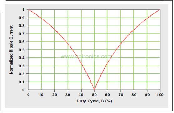 圖3 標(biāo)準(zhǔn)化電容器紋波電流為占空比的函數(shù)