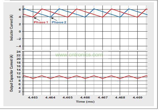圖4 顯示了25% 占空比下一個(gè)二相降壓轉(zhuǎn)換器的仿真結(jié)果。電感紋波電流為2.2A,但是輸出電容器電流僅為1.5A,原因是紋波電流抵消。50% 占空比下使用二相時(shí),電容器完全沒(méi)有紋波電流。