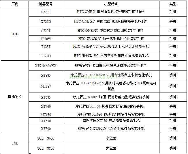 HTC將攜帶他們?cè)贛WC2012上推出的最新四核機(jī)皇ONE X系列參展;摩托羅拉將帶來(lái)8款最熱門的智能手機(jī),從XT910 MAXX無(wú)窮電量的“肥刀”到最新的刀鋒V“彩刀”以及最新三防手機(jī)DEFY都有真機(jī)展出;