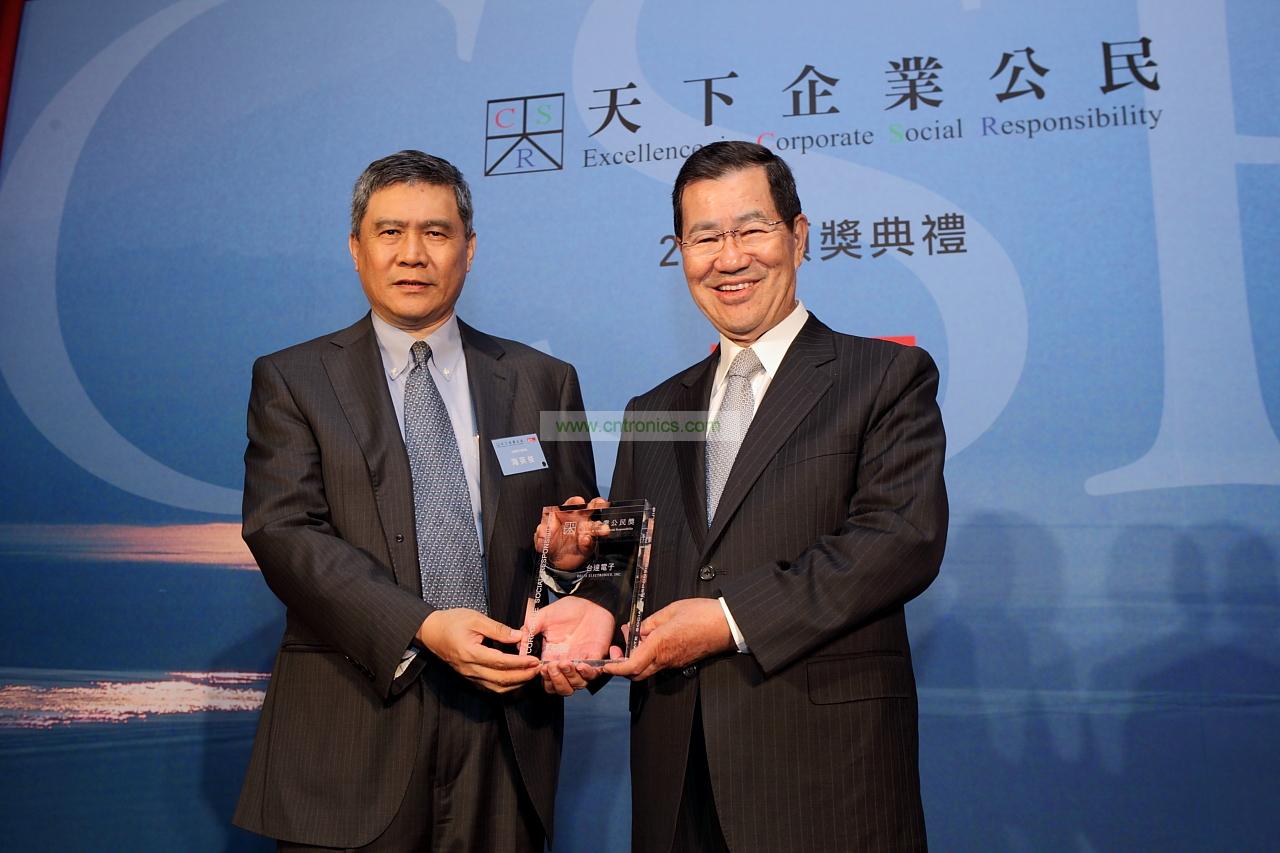 臺達電子海英俊董事長(左)出席2012 天下雜誌企業(yè)公民獎頒獎典禮, 自 蕭萬長前副總統(tǒng)手中接過大型企業(yè) 首獎